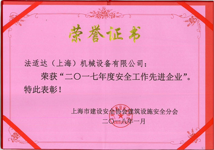 榮獲市“2017年度安全工作先進企業(yè)” 時 間:2018-01-18 22:10:43 瀏覽次數(shù):7519 法適達(dá)榮獲由上海市建設(shè)安全協(xié)會建筑設(shè)施安全分會頒發(fā)的“2017年度安全工作先進企業(yè)”。